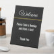 Welcome your visitors with this black and white welcome sign. The display text can be edited to show your desired text. Display text reads: Welcome Please Take a Number and Have a Seat Thank You