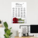 This gorgeous wedding seating chart features a photo of a long-stemmed red rose lying on its side reflecting in a pool of water with waves and ripples. The main title reads "Welcome!" with subtitle reading "please find your table" in elegant lacy script calligraphy. There is space for the up to 200 names with the names of the couple and wedding date below. Wonderful way to help your guests find their tables while making your reception more beautiful.