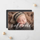 A sweet and elegant birth announcement design featuring a full bleed horizontal or landscape orientated photo with "welcome" overlaid in chic white calligraphy script lettering. Your baby's name and birth stats appear beneath. Add three additional square photos to the back, along with a personal message.