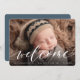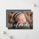 A sweet and elegant birth announcement design featuring a full bleed horizontal or landscape orientated photo with "welcome" overlaid in chic white calligraphy script lettering. Your baby's name and birth stats appear beneath. Add three additional square photos to the back, along with a personal message.