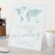 Teal Aqua Turquoise Blue Watercolor World Map Wedding Welcome Sign for a travel theme or destination wedding that's personalised with your reception location, your names, and a moveable heart marking the spot of your adventure, city, beach, or island wedding in any location in the globe. Use the advanced Zazzle template editor to move the heart on the map, or change fonts and background colour to match your colour scheme that coordinates with the faux silver detailed continents map.