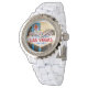 Close up on the Welcome to Fabulous Las Vegas Sign as a background image applied to a fabulous women's rhinestone white enamel watch