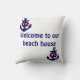 Personalise these beach house decorations. Nautical theme decorative pillow with navy blue and red anchors and buoy. Fun for boating and sailing enthusiasts or lake homes and beach houses. The personalised text template that says welcome to our beach house' is easily changed or deleted entirely prior to purchase. American made Mojo pillow.