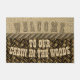 Beautiful contemporary faux burlap, wicker weave texture look pattern and rope. With "Welcome To Our Cabin In The Woods" quote design. Decorative, cute and modern home decor product for decorating the entrance of your home, porch of your beach house, country cottage, log cabin, lake or river vacation home.