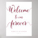 Burgundy 'Welcome to our Forever' wedding sign which can be personalised with the bride and groom's name and wedding date.