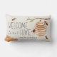 Welcome guests with this cute bee themed lumbar throw pillow featuring watercolor illustrations of honeybees, honeycomb and a hive, with "welcome to our hive" in ivory lettering. Personalise with your family name along the bottom.