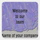 This inexpensive sticker offers a colourful way to welcome a new member of your department or as a welcome to a newly hired employee to your company. The purple splash of colour offers an abstract design suited to many types of businesses. "Welcome to our team" can be customised if you desire. The solid grey colour can be adjusted and there is room at the bottom to add your company's name and/or logo.
