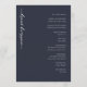 This wedding program features a sophisticated, modern design with a navy blue background and elegant white script typography. The layout is clean and organized, showcasing the ceremony details in a structured format that includes sections for procession, vows, unity ceremony, and recessional. The minimalist aesthetic creates an inviting and formal atmosphere, perfect for couples seeking a timeless and classic look for their special day.