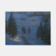 In this fantasy-like scene on a winter night, an icy path leads between snowdrifts down the hill and over the river to a welcoming cottage with candles in the window. The trail and stepstones across the water are lit by warmly glowing lanterns, and a bonfire beside the path sends sparks into the cold night air.