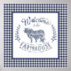 Stylish square wall print features centre "Welcome to the Farmhouse" text with farm animal silhouettes and a blue gingham background