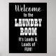 Welcome to the Laundry Room. It's loads and loads of fun! I made this for our laundry room and like it so much that I've decided to share it here. You're looking at an 18" x 24" poster that is ready to frame and hang. The background is balack. The bold typography is white. The sentiment is "Welcome to the Laundry Room. It's loads and loads of fun!" What a fun housewarming gift for new homeowners or anyone who wants to spruce up their space.