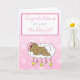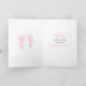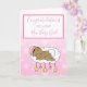 Congratulations on your new baby girl, baby footprints, baby sleeping on a cloud pink with white stars card for new parents. This baby is drawn with darker skin to represent babies of colour.