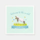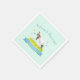 Spring lamb skipping cute new baby welcome to the world personalised aqua party napkins. Cute new baby card featuring cute a watercolor painting of a whimsical lamb skipping in a flower meadow with yellow and blue butterflies, your own name choice in a teal aqua graphic ribbon. Cute lamb on a light aqua blue sky background ideal for a farm themed new baby themed baby welcome party or gathering. Other cute sheep matching items available. © Uniquely painted in watercolor and designed by Sarah Trett for www.mylittleeden.com