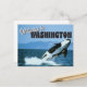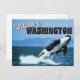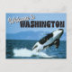 Welcome to the. state of Washington with a photo of a jumping Orca whalewith coastline mountains in the background, and Welcome to Washington greeting in vintage style fonts.