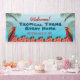 Welcome banner for any tropical or beach theme event shows parrots, palm trees, flowers. Edit all text for your event. Great for luau, tiki party, family reunion, birhday, or any event.
