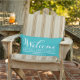 Stylish outdoor pillow design features "Welcome" in modern white script writing with custom family name text and scroll decorative accent. The turquoise blue background colour that can be customised to coordinate with your decor.