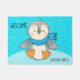 Sweet penguin artwork. Patterned blue background. Custom welcome door mat with adjustable text. Options for changes on welcome text and family name. Fast and easy to use template.