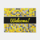 This door mat design features a grid-like tiled squares pattern coloured various shades of yellow and grey. It also features the friendly message "Welcome!" on the front in yellow script-like text.