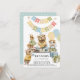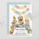This cute boy's birthday party invitation features "happy birthday" bunting flags, a bear with a party hat, surrounded by toy trains, squirrel, mouse, and a cat with balloons. The reverse side features a light blue background with white polka dots. Personalise for your needs. You can find matching products at my store.