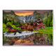 A golden sunset, mountain waterfalls, and green pine trees surround the Wells Fargo stagecoach as its team of horses rush it across mirror lake making a magnificent reflection for a wild west picture.