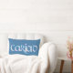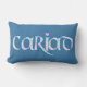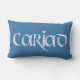 A fun lumbar pillow with the Welsh word 'cariad' in a Celtic script, filled with a pretty floral pattern outlined in bright blue on a deep blue background. Perfect gift for the one you love!