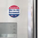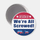 in white outlined in blue. The centre white section has text that says, "We're All Screwed!" in blue