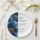These elegant navy blue and gold floral engagement party paper plates can be personalised with your information in modern typography. Designed by Thisisnotme©