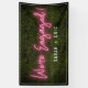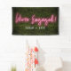 Pink neon sign inspired "We're Engaged" heart design over boxwood inspired background with custom white text for bride and groom's names.