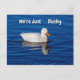 A cute little white duck is swimming around in bright blue water. A great way to check in with friends and family.