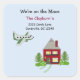A cosy little house with trees and shrubs. An aeroplane in the sky. A fun way to share your new address. Customise with your family name and address as desired.