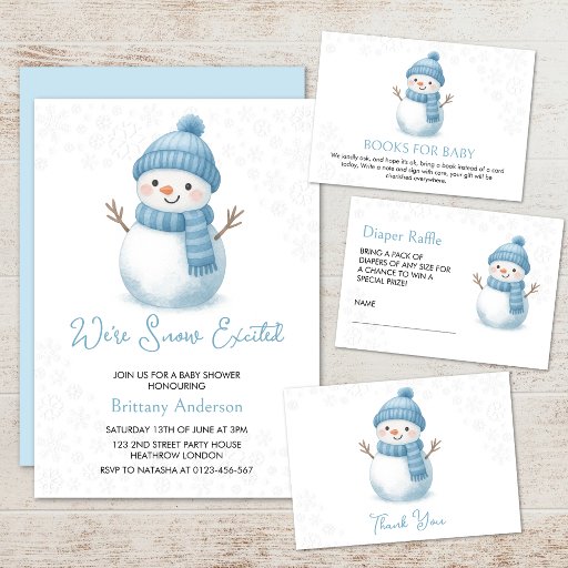 This design features winter baby shower theme "We're Snow Excited" with a cute watercolor snowmen in blue. This product can be easily personalised.
