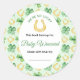 A charming St. Patrick’s Day baby shower round sticker featuring a soft green background, golden horseshoes, and scattered four‑leaf clovers for a sweet “lucky charm” theme. The central white oval frames the event details beautifully, creating a warm, welcoming design perfect for celebrating a growing family. Ideal for March celebrations, Irish‑inspired themes, or any baby shower that embraces luck, joy, and new beginnings.