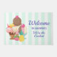 A fun welcome doormat with an ice cream theme which says: we're the coolest. Illustrated with drawing of a 3 scoop ice cream sundae with colourful sprinkles. An ice cream cone with scoops of chocolate, strawberry and vanilla. A bowl of neopolitan ice cream with a cherry on top. Strawberries and a pineapple fruit sit beside the bowls. Summery and sweet. A mint green and white stripes pattern in the background.