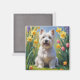 A cheerful dog sits peacefully on lush green grass, surrounded by colourful spring blooms under a soft blue sky. This digital oil painting captures a serene moment with expressive brushstrokes, warm colours, and a sense of gentle joy.