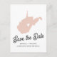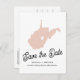 Modern WEST VIRGINIA State Destination wedding save the date with WEST VIRGINIA State silhouette in blush pink with with heart, save the date in a contemporary font and your name and wedding date along the bottom. On the back a space for a custom message and your return address.