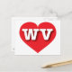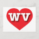 This postcard features a vibrant red heart containing the bold, white, upper case letters WV, the official abbreviation for West Virginia, the mountain state. The reverse side of the postcard is blank, awaiting your customised text or handwritten sentiments.