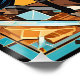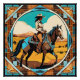 A portrait of a woman on a horse with a desert background and an abstract border.