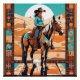 A portrait of a woman on a horse with a desert background and an abstract border.