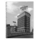 A decorative concrete railing angles across the foreground beginning in the lower left corner of the frame. Aside from a few much shorter buildings to the left of the Western Auto tower, the background is sky with a few clouds.