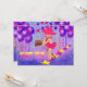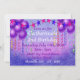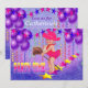 Baby cowgirl in pink on a stick horse. The background is purple with balloons, streamers and stars. Personalise the back side by replacing my sample text with the details of your party.