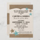 Country rustic style invitation to a casual barbecue style wedding reception. Western stars and leather inspired design in warm brown and aqua blue tones.