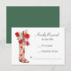 This RSVP card features a rose decorated western boot filled with pink and red roses, and makes a cute RSVP card for a western themed wedding. Beside the image is your custom text in dark teal green. The images and text are placed on a white background. The back of the invitation is matching teal green. Be sure to see the matching wedding invitations in our store.