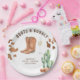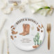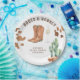 This design features modern neutral colours in a watercolor application. Design in cow print, glass of champagne, desert cactus, cowboy boots.