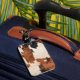 The cowhide leather details are simulated in the artwork. No actual cowhide or leather will be used in the making of this product.