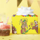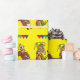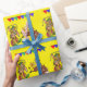A fun cartoon bull rider and rodeo clown with rodeo arena flags on gift wrapping paper.