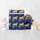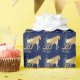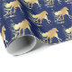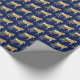 A gold horse silhouette with gold accents on blue gift wrapping paper.