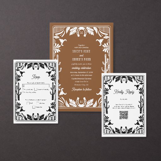 A modern Western cowboy cowgirl style design with hand drawn elements of a cow skull, horseshoes, floral and cactus ornaments. Black and white floral border wedding design featuring hand drawn floral, cactus, cow skull and horseshoes. This contemporary modern Western country wedding design is ideal for all seasons. An elegant black and white ranch, farm or barn style design featuring hand drawn illustrations. A Western Country cowboy themed wedding wine label design with modern elegant elements. Matching wedding invitations and other stationery items are also available.