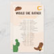Yeehaw! Get your guests laughing and guessing with our Western-inspired "Would She Rather" baby shower game. Featuring playful cowboy hat and cactus designs, this game will add a fun twist to your celebration. See who knows the mummy-to-be best as they answer amusing and insightful questions.
