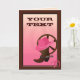 A graphic illustration of a western wagon wheel, cowgirl hat and cowboy boots on a custom cowgirl greeting card. The card has text templates for your personalisation. Original artwork: Copyright Charmaine Paulson