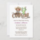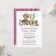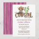 An adorable graphic of a little cowgirl dressed in denim dungarees; wearing brown cowboy boots and a large, oversized stetson hat is sitting on the word "cowgirl" which has marquee lights and brown, rusted leather on it. She has rosy pink cheeks and blonde hair and is smiling sweetly at you. A green watercolor cactus with pretty pink marks on it appears to her right and the back has a purple woodgrain background. These are ideal for a baby shower or rustic western theme party.